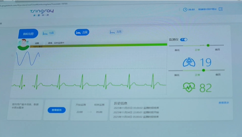 房间内,每张床边都配有智能生命体征监测设备,24小时监测老人的呼吸、心率和睡眠等状况,实时向护理人员发出提示或警报;