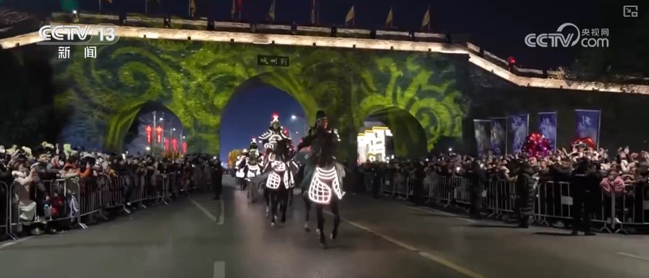 更有2026架无人机腾空而起,勾勒出“万马奔腾”“凤凰展翅”光影长卷,让游客惊叹。还有为古城墙披上斑斓外衣的荆风楚韵灯光秀,让大家赏心悦目。光影流转间,放佛历史与现代隔空对话。