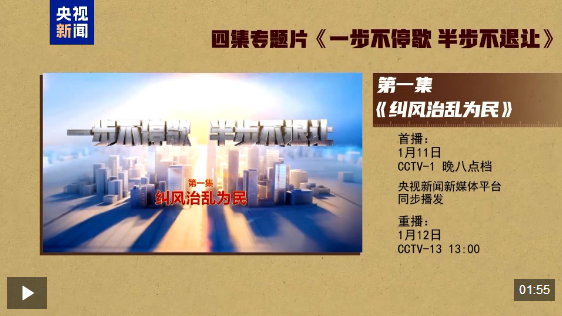 电视专题片《一步不停歇 半步不退让》第一集《纠风治乱为民》,讲述纪检监察机关不断加大风腐同查同治力度,锲而不舍落实中央八项规定精神,严肃查处违规吃喝背后的团团伙伙、请托办事和利益输送,集中整治群众身边不正之风和腐败问题,让群众真切感到正风反腐加力度、清风正气在身边。总台央视综合频道1月11日晚8点档播出,央视新闻新媒体平台同步播发。