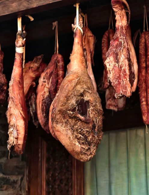 盐搓好后,还要在每一块肉上薄薄地撒一层盐,再将一块块敦实的肉挂上晾架,最后套上一层薄薄的纱布,置于阴凉的墙角。剩下的,便交给时间。