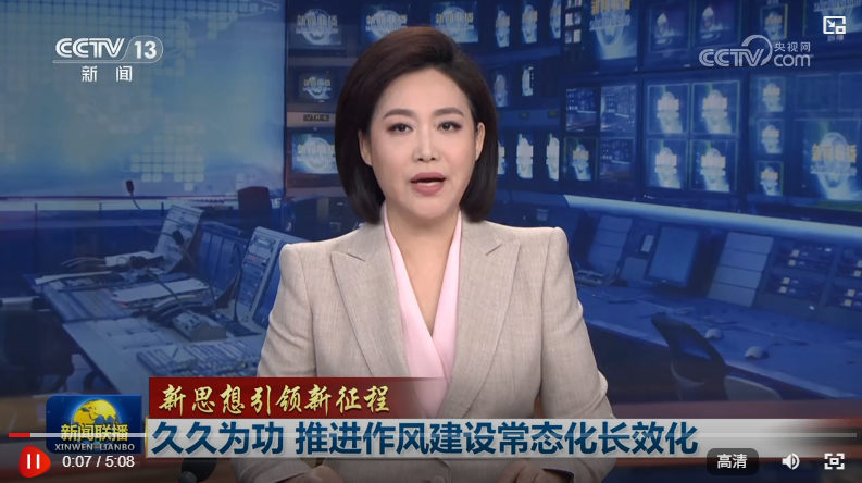 央视网消息(新闻联播):习近平总书记指出,中央八项规定是党中央徙木立信之举,是新时代管党治党的标志性措施。2025年,以习近平同志为核心的党中央坚持把中央八项规定作为铁规矩、硬杠杠,以打攻坚战、持久战的决心和恒心,毫不松懈整治“四风”顽瘴痼疾,持续擦亮“八项规定”金色名片,以作风建设新成效推动保持党的先进性纯洁性、不断赢得人民群众信任拥护,为进一步全面深化改革、推进中国式现代化提供有力保障。