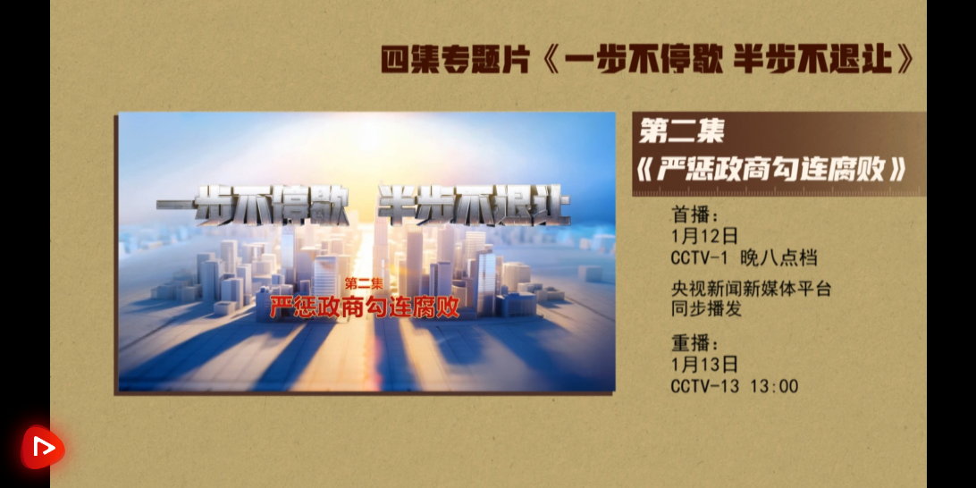 反对腐败、建设廉洁政治,是我们党一贯坚持的鲜明政治立场,是党自我革命必须长期抓好的重大政治任务。要把严惩政商勾连腐败作为攻坚战重中之重,坚决打击以权力为依托的资本逐利行为,坚决防止各种利益集团、权势团体向政治领域渗透,不断净化政治生态,推动构建亲清统一的新型政商关系,促进经济社会高质量发展。电视专题片《一步不停歇 半步不退让》第二集《严惩政商勾连腐败》,讲述纪检监察机关聚焦政治问题和经济问题交织的腐败案件,严惩以商养官、以官护商、官商一体等问题,坚决破除政商勾连“利益共同体”。总台央视综合频道1月12日晚8点档播出,央视新闻新媒体平台同步播发。