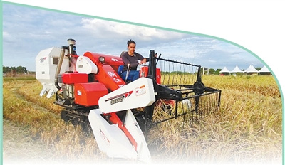 在巴西阿波迪的一处稻田里,一名巴西妇女在家庭农场操作中国生产的水稻联合收割机。 |