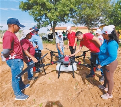 在巴西北里奥格兰德州联邦教育科技学院阿波迪校区农场,巴西师生和农户学习操作中国生产的无人机。 |