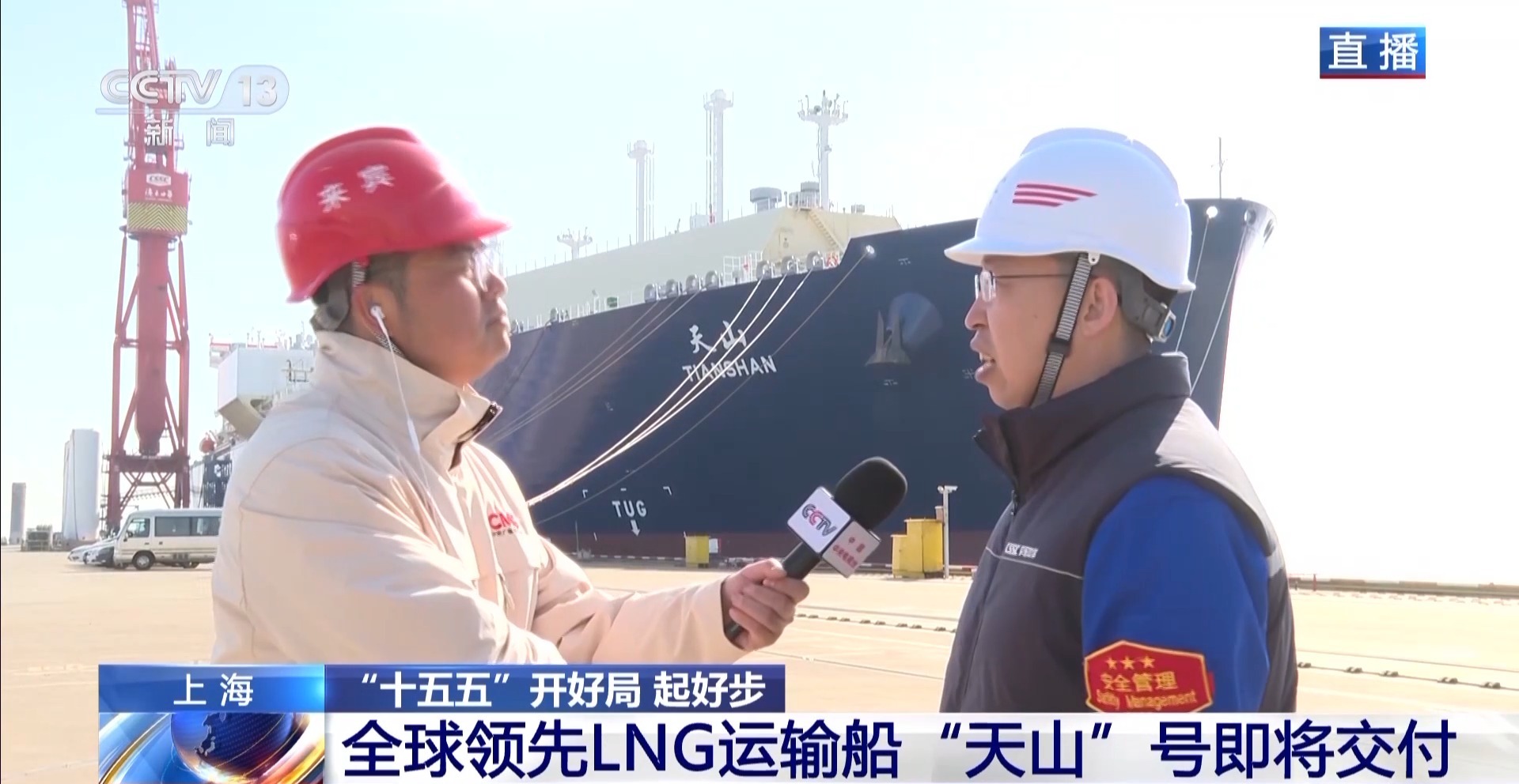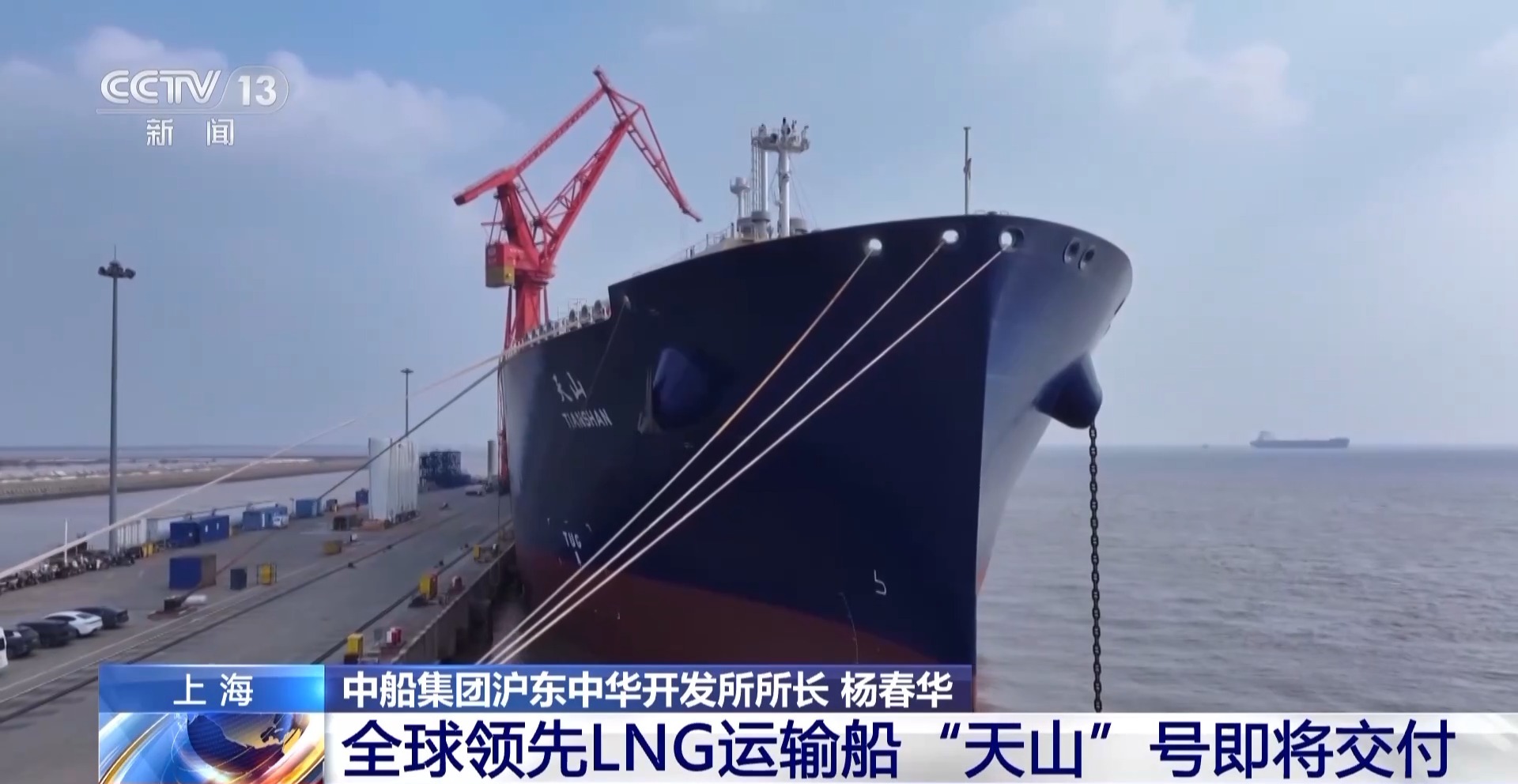 总台记者肖冰毅介绍,本月底即将交付使用的17.4万立方米大型LNG运输船“天山号”体量惊人,这艘船总长295米、宽45米,甲板面积相当于3个标准足球场大小。