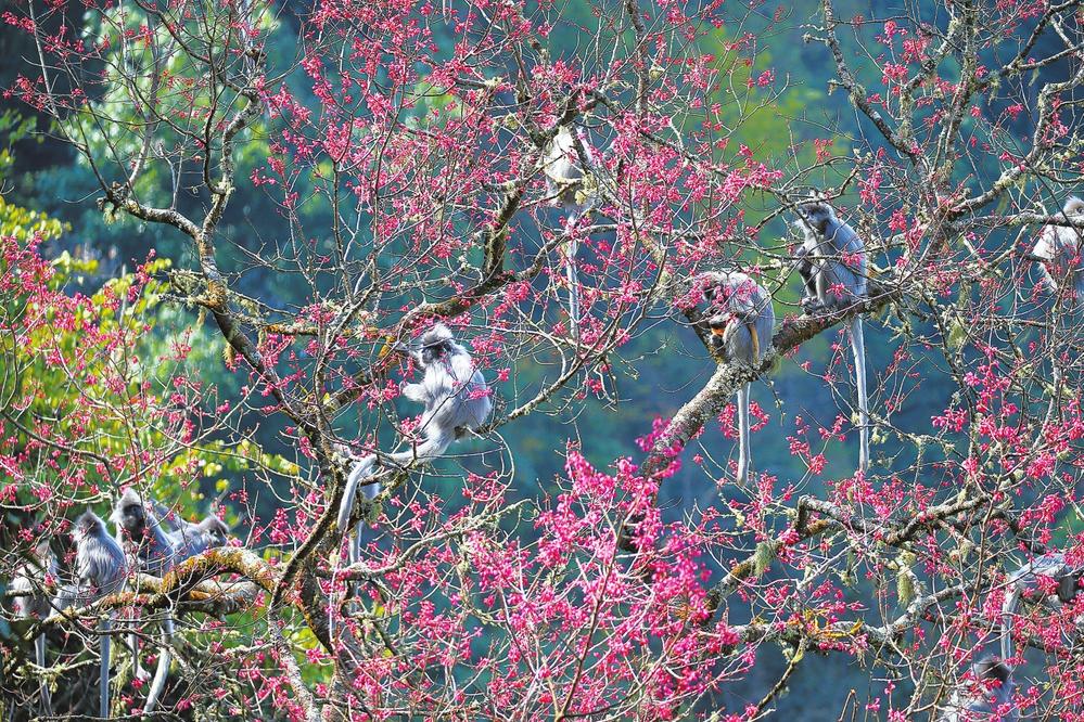 每年11月至次年1月,云南无量山国家级自然保护区景东片区的冬樱花如期绽放。在这片绯红如霞的花海中,国家一级保护动物印支灰叶猴携家带口采食樱花的灵动场景,已成为摄影爱好者年复一年的期待。