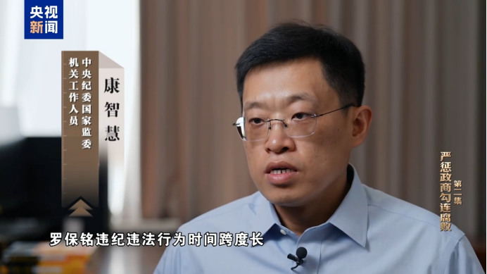 中央纪委国家监委机关工作人员 康智慧:罗保铭违纪违法行为时间跨度长、涉及范围广、危害程度深,政商关系错综复杂,利益链条盘根错节,具有政治问题与经济问题交织、自身腐败与家族式腐败相交织的特点。