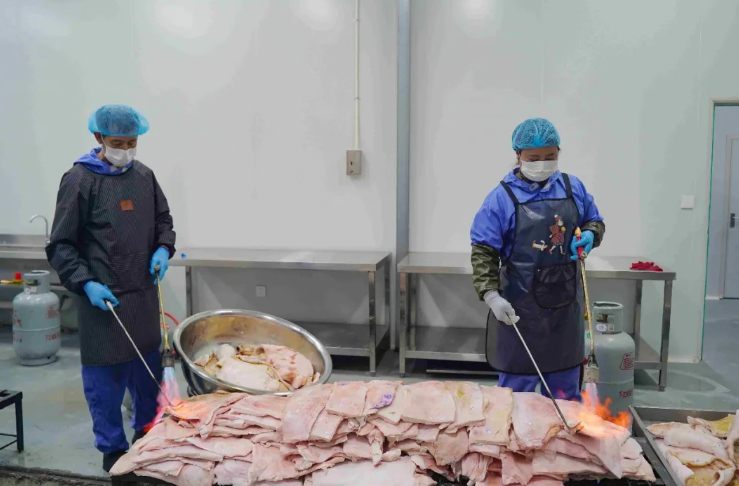 走进车间,4条标准化生产线高速运转,清洗、切块、包装等工序井然有序。工人们身着统一工装,新鲜猪脚经过多道工序入味,本地萝卜丝酸菜真空分装,黑皮子、蘸水等配料同步加工,所有食材均来自后所镇及周边村寨,企业坚守传统工艺,再通过标准化生产把控品质,让消费者吃到地道的富源味道。