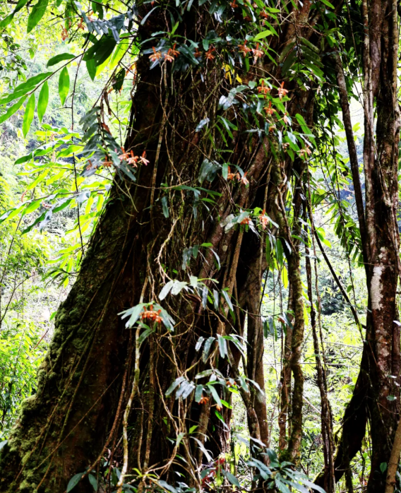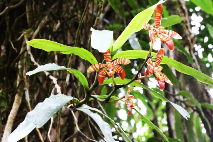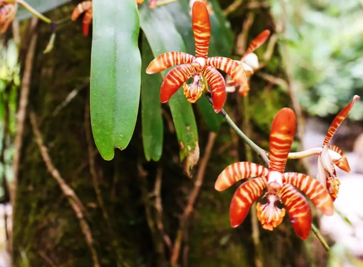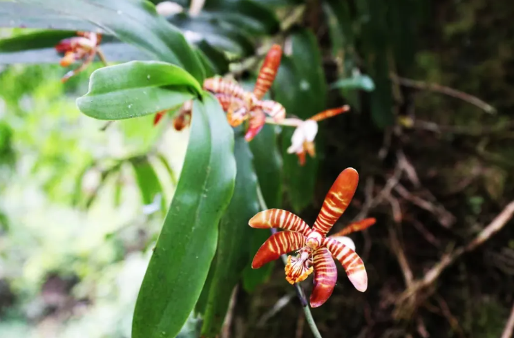 工作人员发现,在海拔约1700米的山地疏林中,几丛口盖花蜘蛛兰附生在一棵乔木的树干上,其叶片为长圆形,呈现出鲜亮的绿色,发达的根系紧密地盘旋在树干表面,一朵朵盛开的花具有红棕色斑纹,花的形状和纹路都非常像蜘蛛。微风吹来,花儿在风中摇曳,仿佛一群优雅的舞者在进行一场无声的表演。