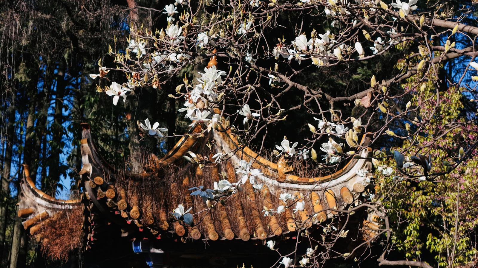 昙华寺的冬日,因玉兰而浪漫。清晨的阳光穿透薄雾,洒在中园玉兰园的花枝上,上百株玉兰树相继绽放:白玉兰似雪、二乔玉兰粉白相间、紫玉兰色泽艳丽却不显俗气。花瓣层层叠叠,在微风中轻轻摇曳,淡淡的幽香弥漫在空气中。