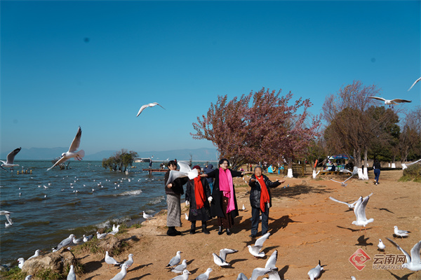这里不仅是摄影爱好者捕捉美好的天堂,也让人们切身感受到人与自然和谐共处的温馨场景。成群的红嘴鸥在湖畔嬉戏觅食,游客在樱花树下驻足流连,共同构成了冬春之交春城最温暖而富有诗意的风景。