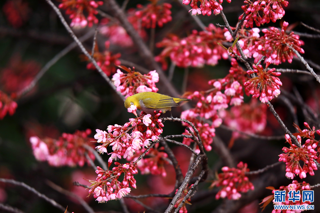 傲立冬樱花间的鸟儿(1月13日摄)。新华网发(马卫忠 摄)
