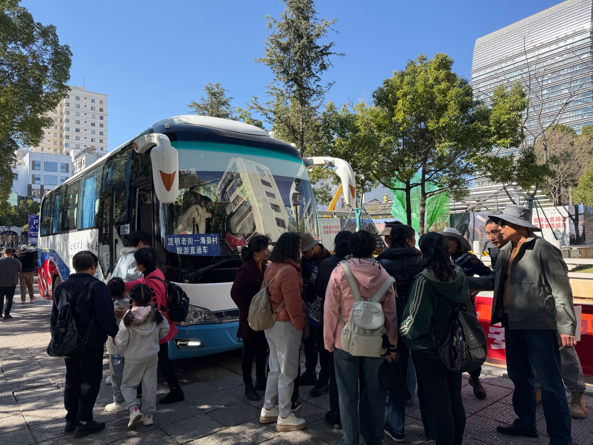 “您好,到海晏村怎么购票?”“扫码关注公众号,线上购票后就能上车。”20日下午2点45分,云瑞中路与云瑞东路交叉口停着两辆大巴车,车头前放着醒目指示牌“昆明老街——海晏村直通车”。前来乘车的游客络绎不绝,工作人员在一旁耐心地教大家购票。尽管距离发车时间还有一会儿,但车上的座位已经坐满了乘客。
