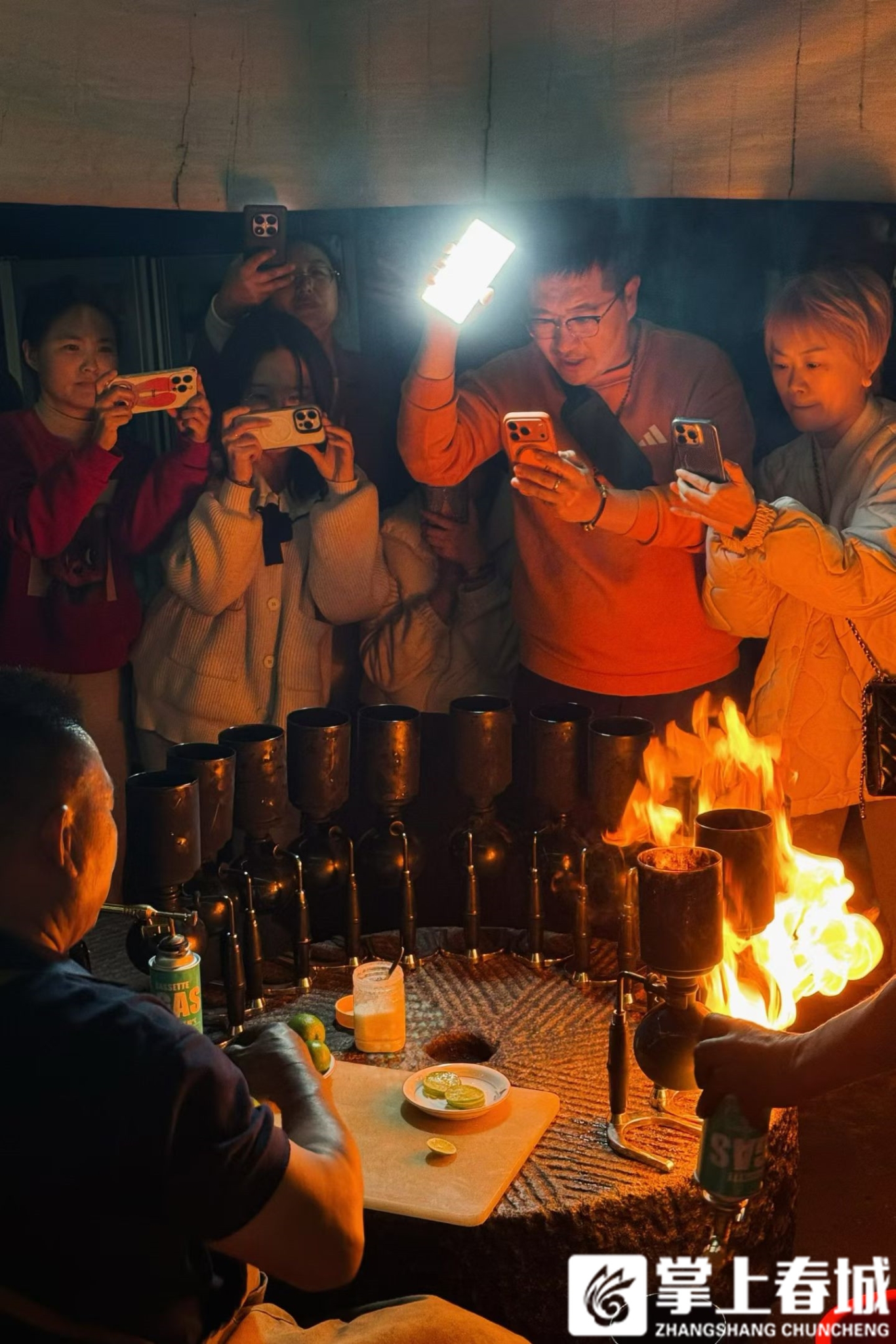 “人家都用咖啡机、手冲壶,你为啥偏用喷枪烧?”面对好奇的客人,李金合总会端起虹吸壶,讲述他的“中式土法”。早年见老乡用酒精灯熬咖啡火候难控,风味尽散。爱琢磨的李金合向来摊喝咖啡的师傅请教,结合喷枪加热与虹吸原理,独创了“火烧咖啡”技法。“要让咖啡液像怒江水一样奔涌回壶,锁住风味。”他眼神专注,手中喷枪火焰稳而匀。