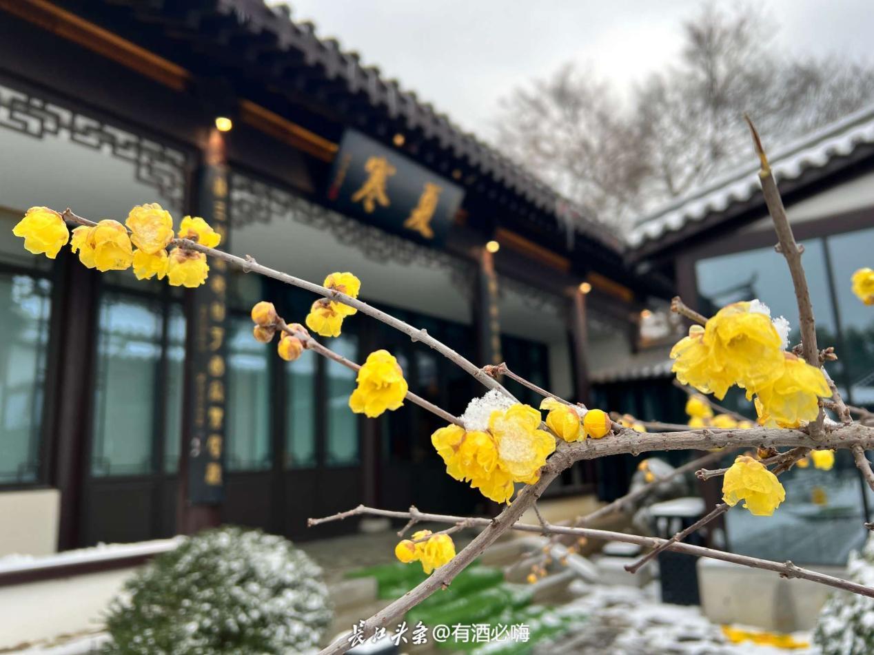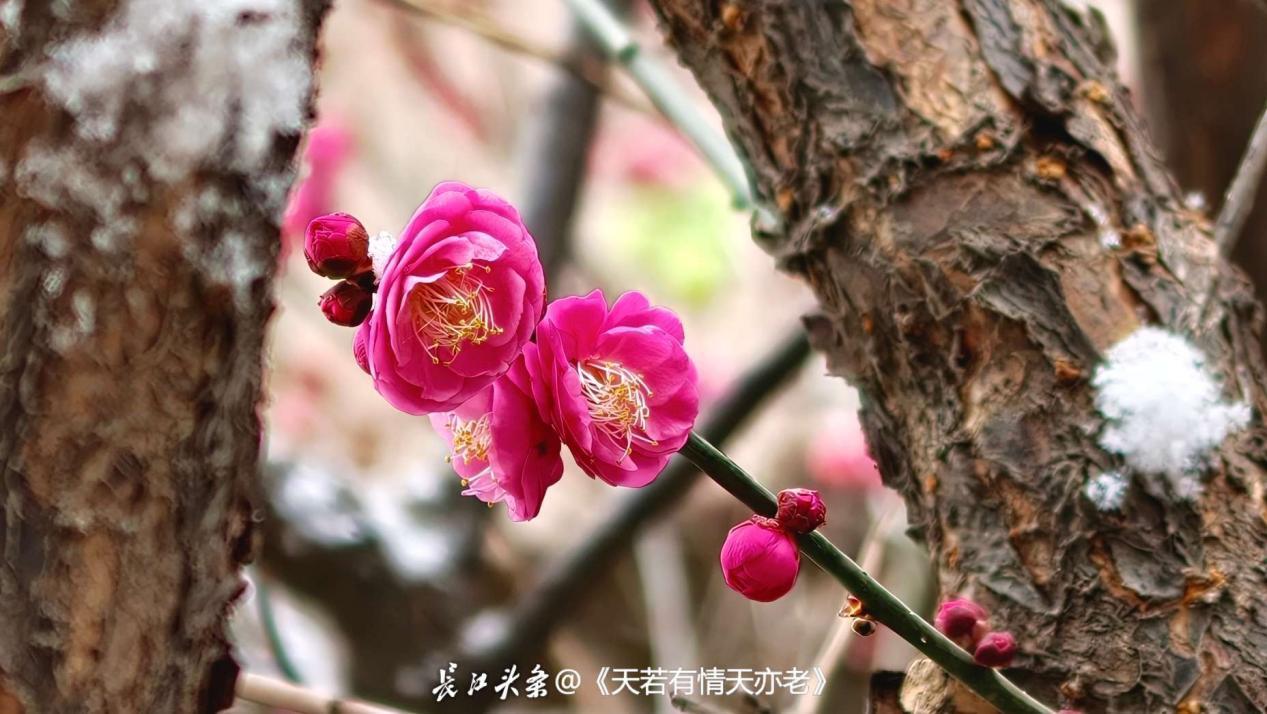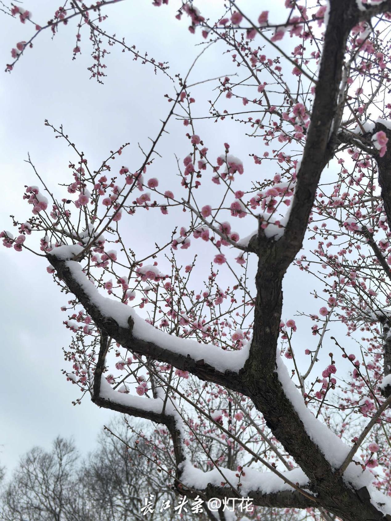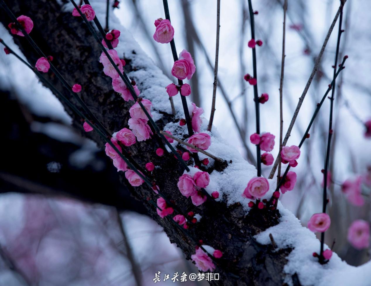 2、梅花花期集中在12月下旬至次年2月,当前初雪与早梅相遇,正是打卡好时机;