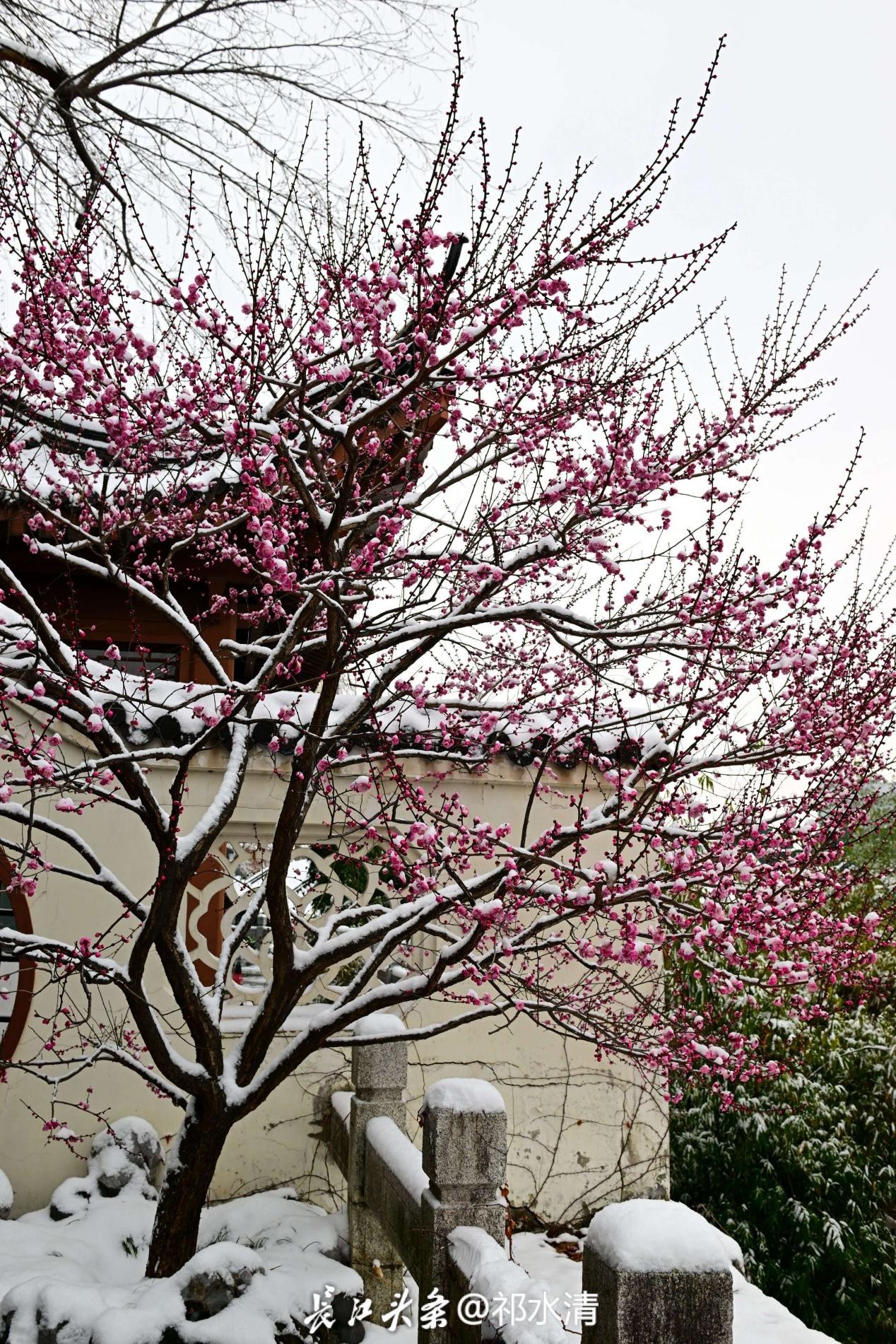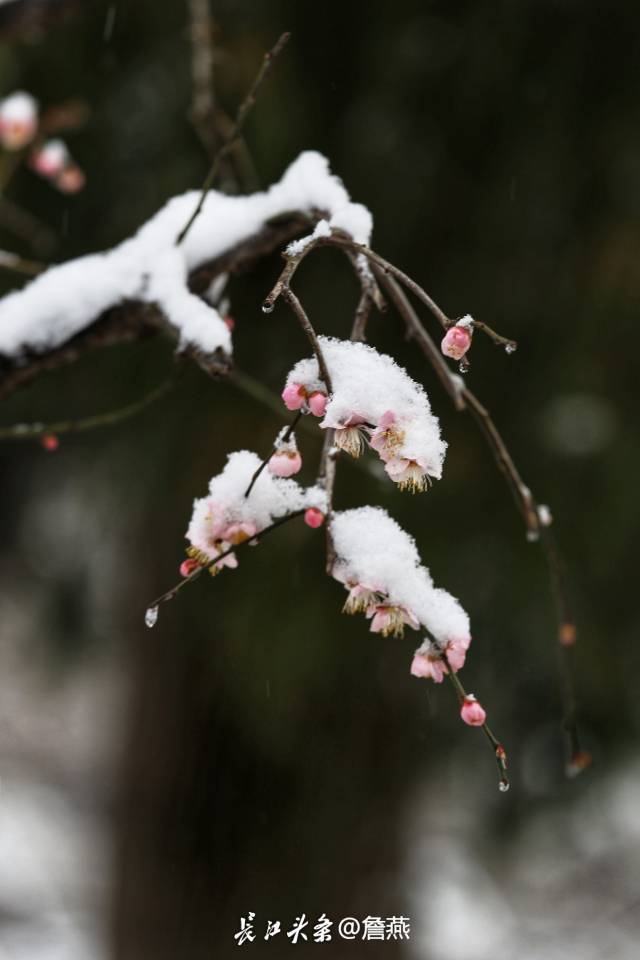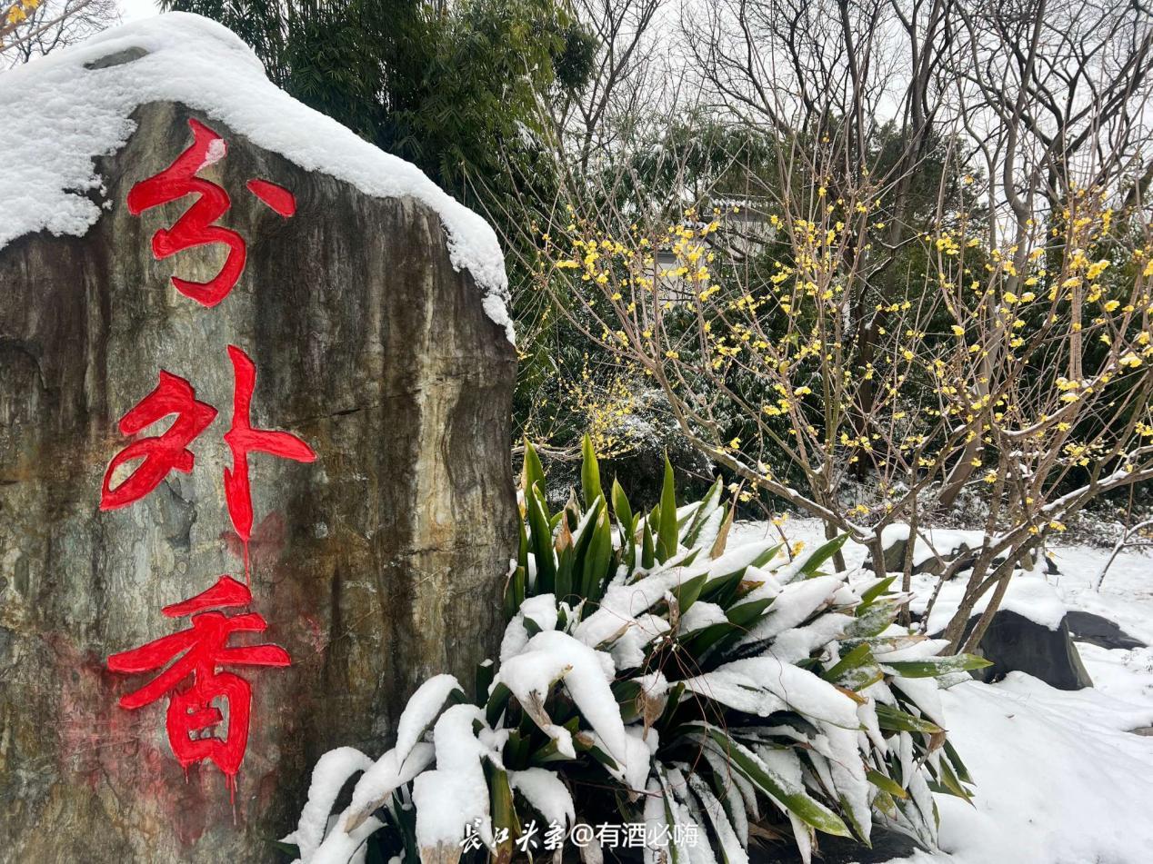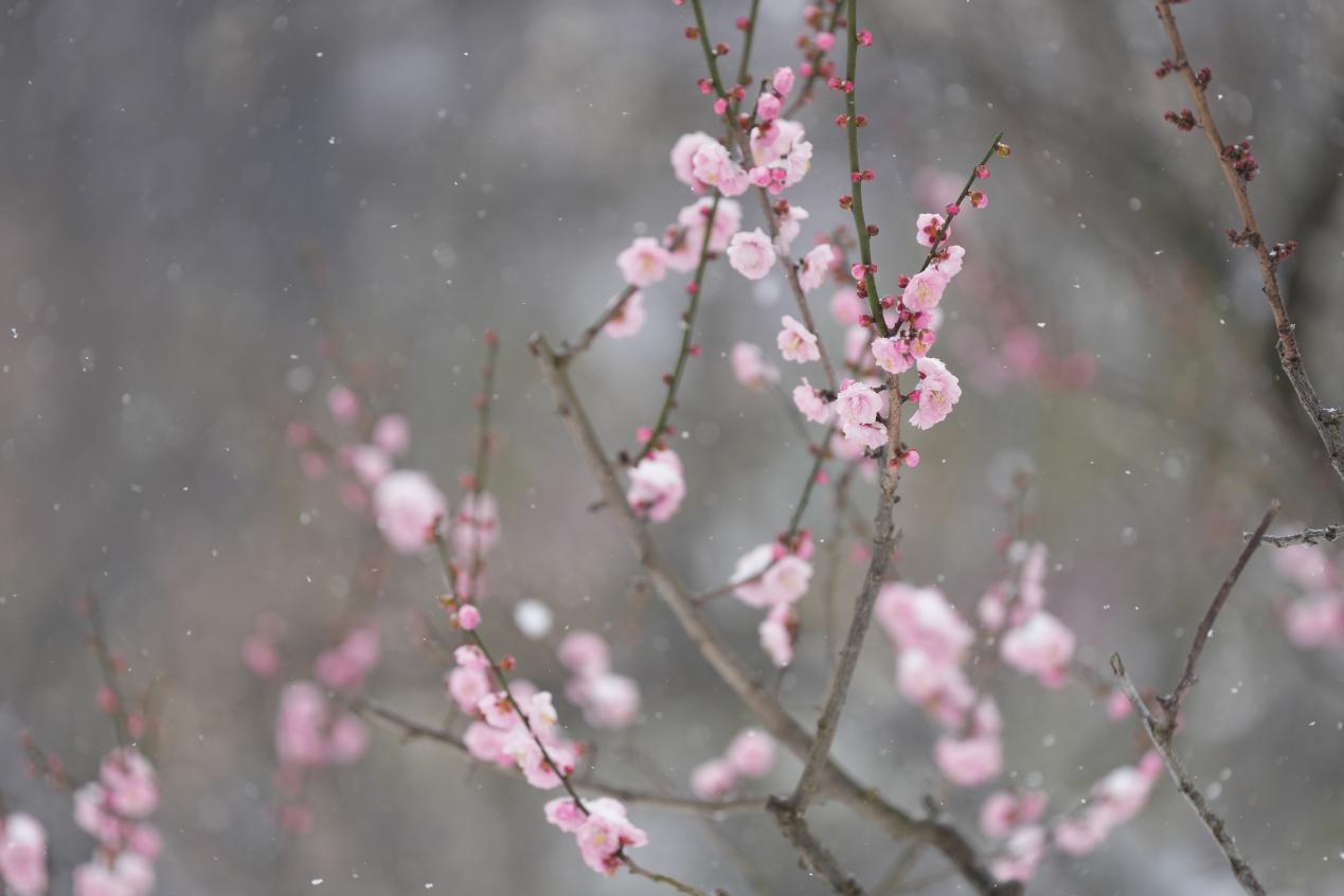 2、梅花花期集中在12月下旬至次年2月,当前初雪与早梅相遇,正是打卡好时机;
