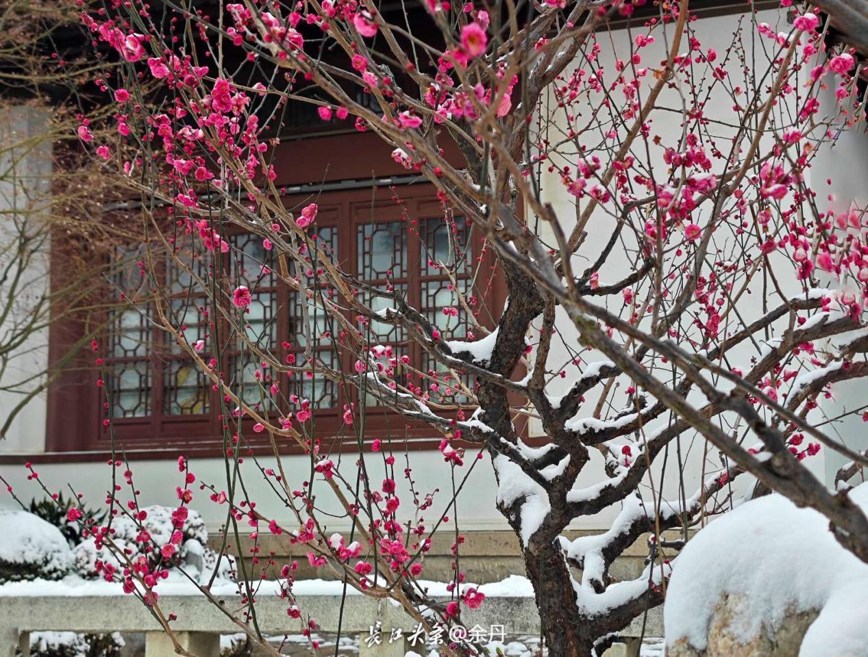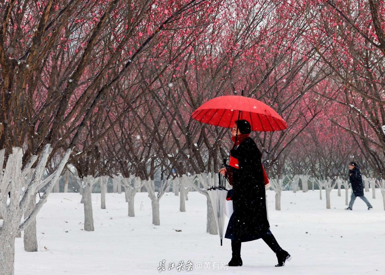 东湖梅园红梅覆雪,点点嫣红缀在皑皑白雪间;江滩步道寒梅映雪,暗香浮动沁人心脾;解放公园梅枝探雪,疏影横斜尽显风骨……一张张美图,定格雪与梅的邂逅,有网友赞叹:“梅花才是武汉的顶级审美。”
