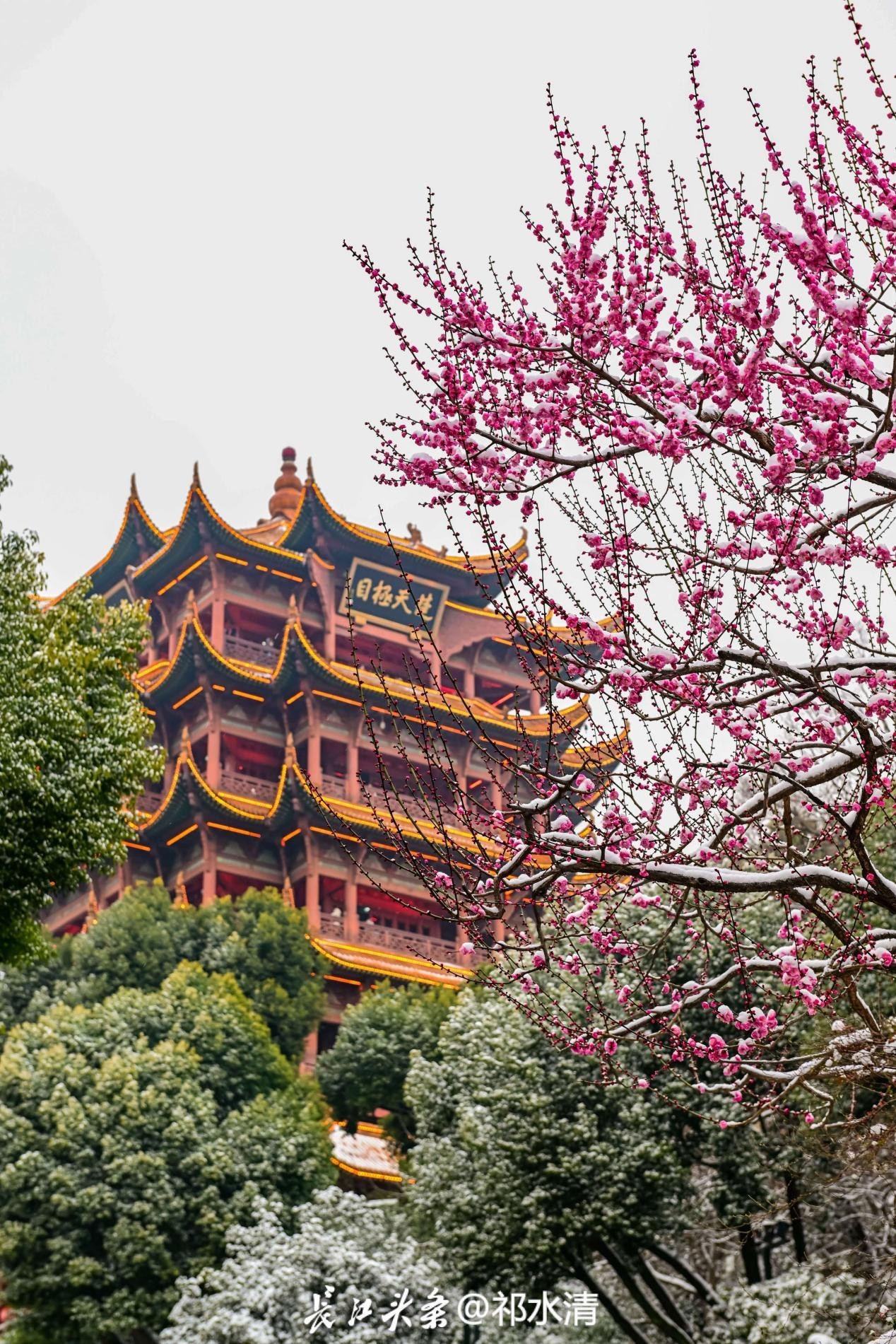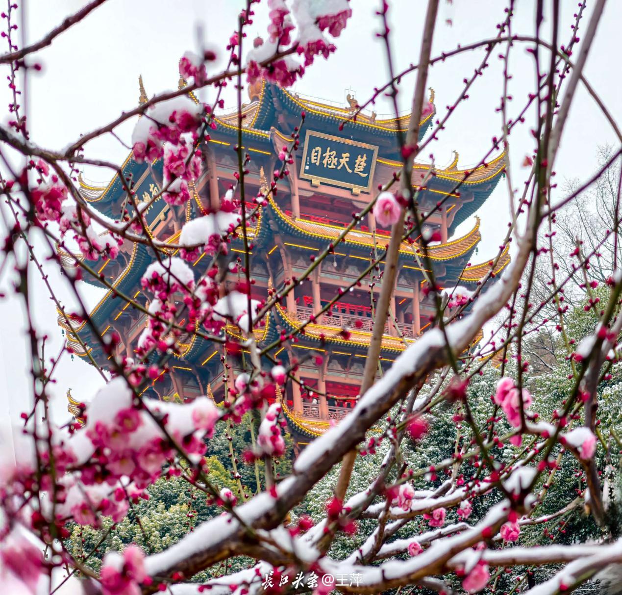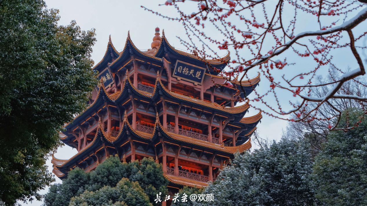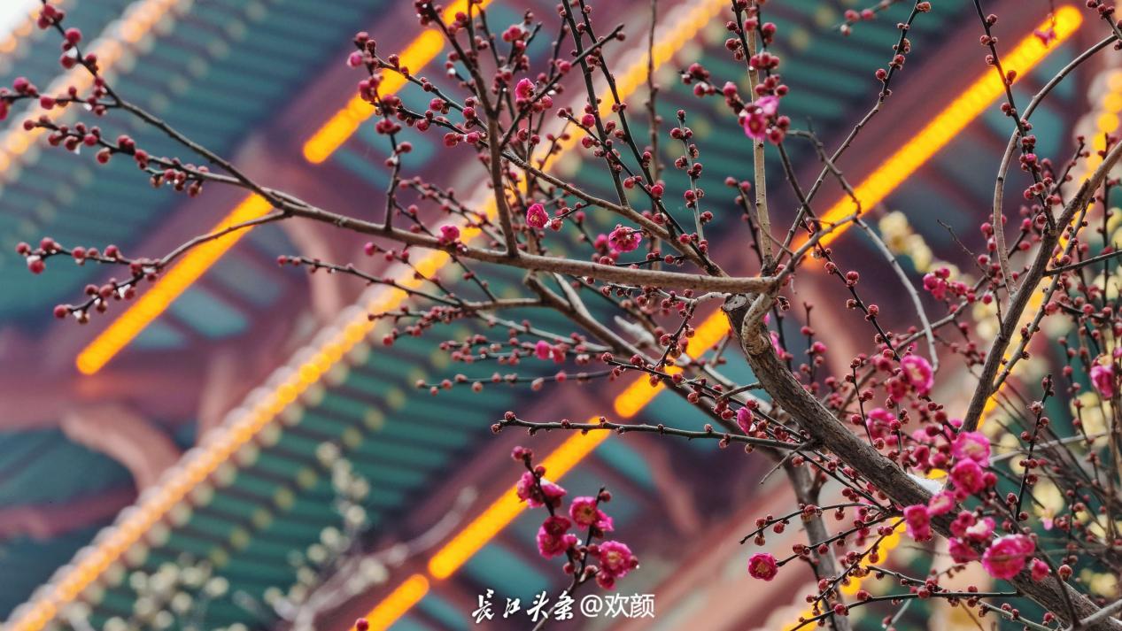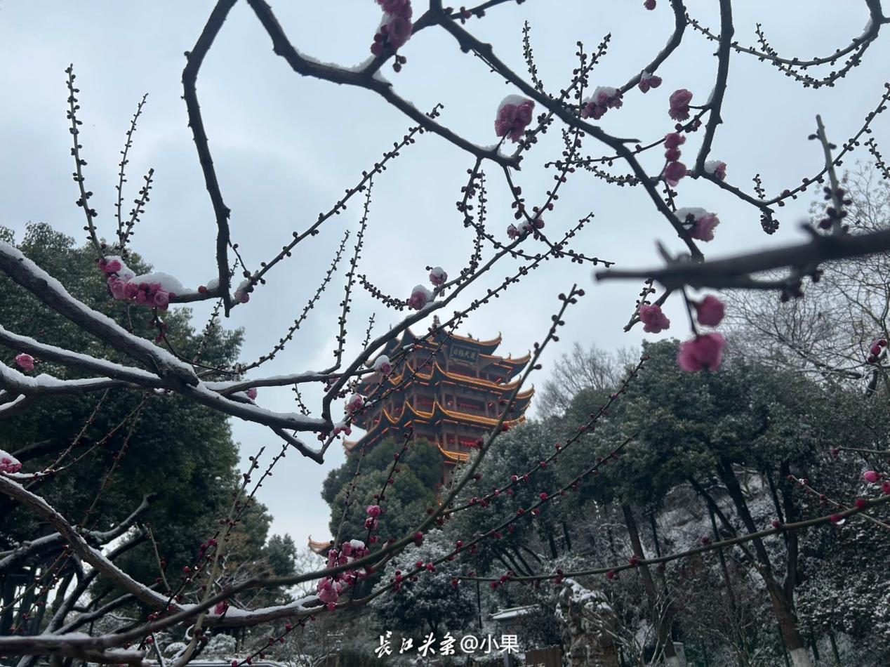 如今,这份文艺气质仍在延续。黄鹤楼公园在跨鹤亭旁采纳专家建议,以“品”字形种植红梅,衬托古亭之美,现已成为热门打卡点。