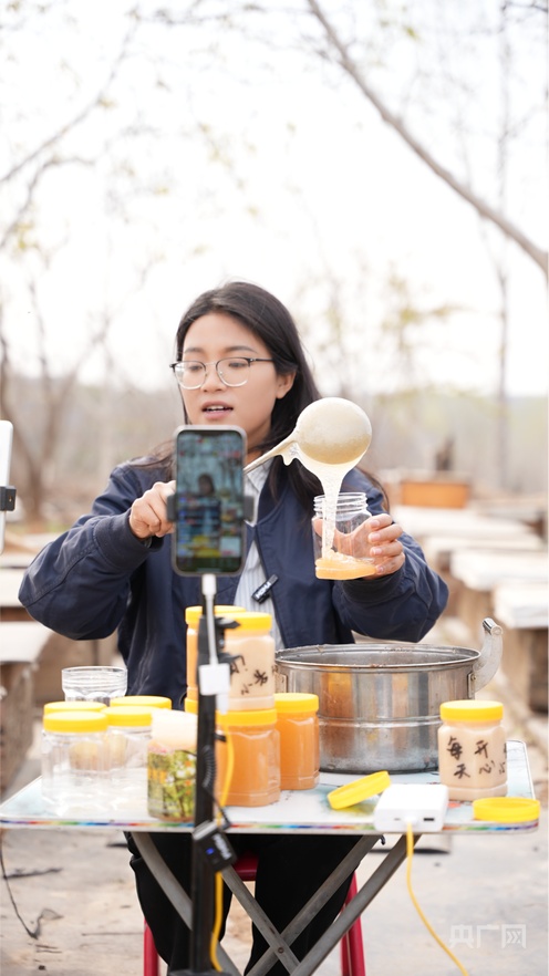 三家村党支部书记张桂芳正在通过直播方式帮助村民销售蜂蜜(央广网发 受访者供图)