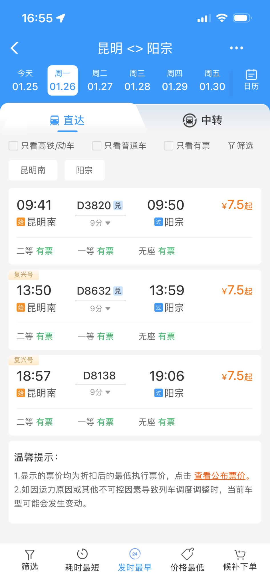 去昆明阳宗海风景名胜区可以乘坐高铁啦!1月26日,南昆客专(云桂高铁)阳宗站将正式开办客运业务。1月25日,记者登录12306,查询从“昆明南”到“阳宗站”,发现共有3列动车可以到达,发车时间分别为9:41、13:50、18:57,二等座票价为7.5元,一等座票价为12元。