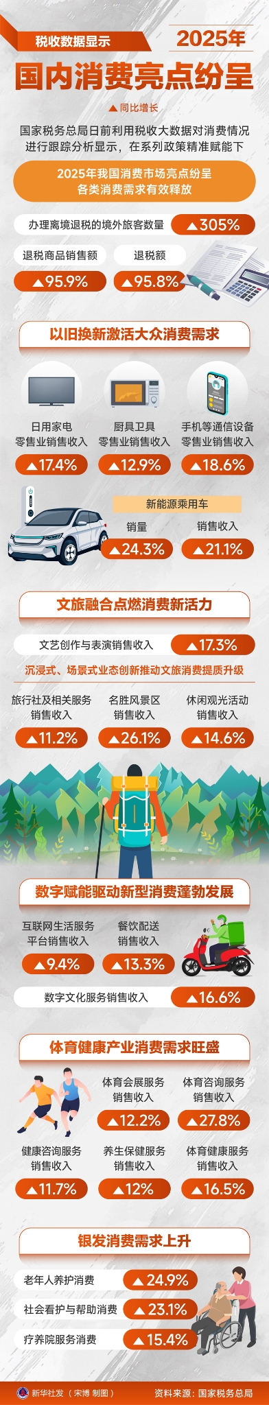 新华社北京1月26日电 记者刘开雄 记者1月26日从国家税务总局获悉,国家税务总局日前利用税收大数据对消费情况进行跟踪分析显示,在系列政策精准赋能下,2025年我国消费市场亮点纷呈,各类消费需求有效释放。其中,办理离境退税的境外旅客数量同比增长305%,退税商品销售额同比增长95.9%,退税额同比增长95.8%。
