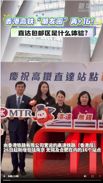 由香港铁路有限公司营运的高速铁路(香港段)26日起新增包括南京、无锡及合肥在内的16个站点。由此,从香港西九龙站出发,可通达的内地站点增至110个,覆盖全国19个省、自治区、直辖市。