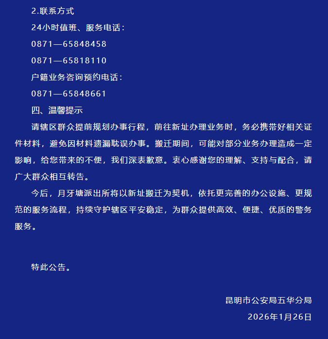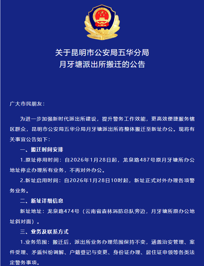 1月26日,昆明市公安局五华分局发布关于昆明市公安局五华分局月牙塘派出所搬迁的公告,详情如下↓