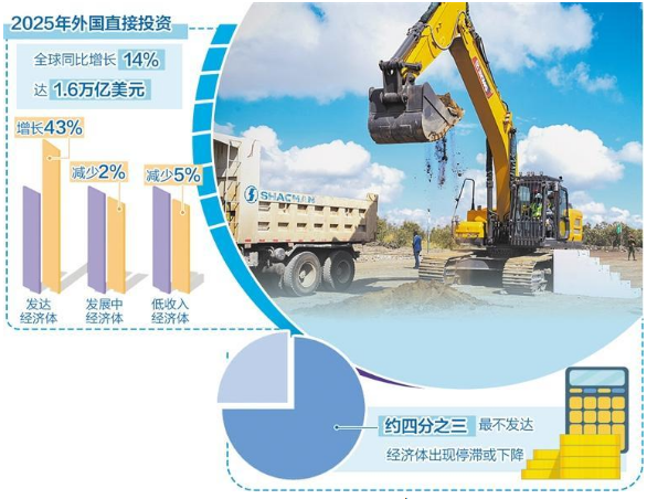 联合国贸易和发展会议(以下简称“贸发会议”)日前发布最新一期《全球投资趋势监测》报告指出,2025年全球外国直接投资(FDI)同比增长14%,达到1.6万亿美元,但增长主要是由于技术性反弹,并不意味着实体投资全面复苏。