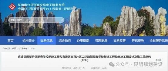 日前,云南省公共资源交易信息网发布《官渡区国贸片区配套学校新建工程和官渡区金马片区二环路侧配套学校新建工程勘察施工图设计及施工总承包(EPC)》招标计划。根据计划,项目总投资金额22373.47万元。