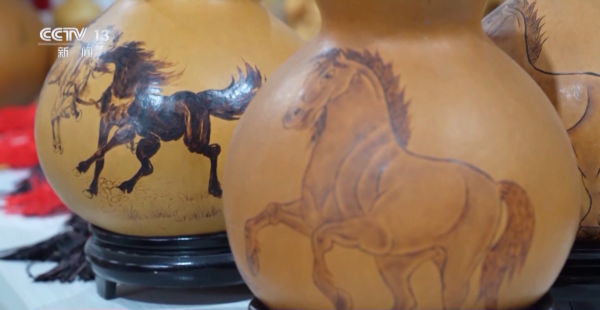 在临泉县这家工艺品公司的厂房里,手艺人们正在凝神创作葫芦烙画。临泉葫芦烙画,是安徽省级非物质文化遗产。今年,以马元素为主题的图案成了绝对主角。创作者手握电烙笔,在葫芦表面细致勾勒出各种马的生动造型。