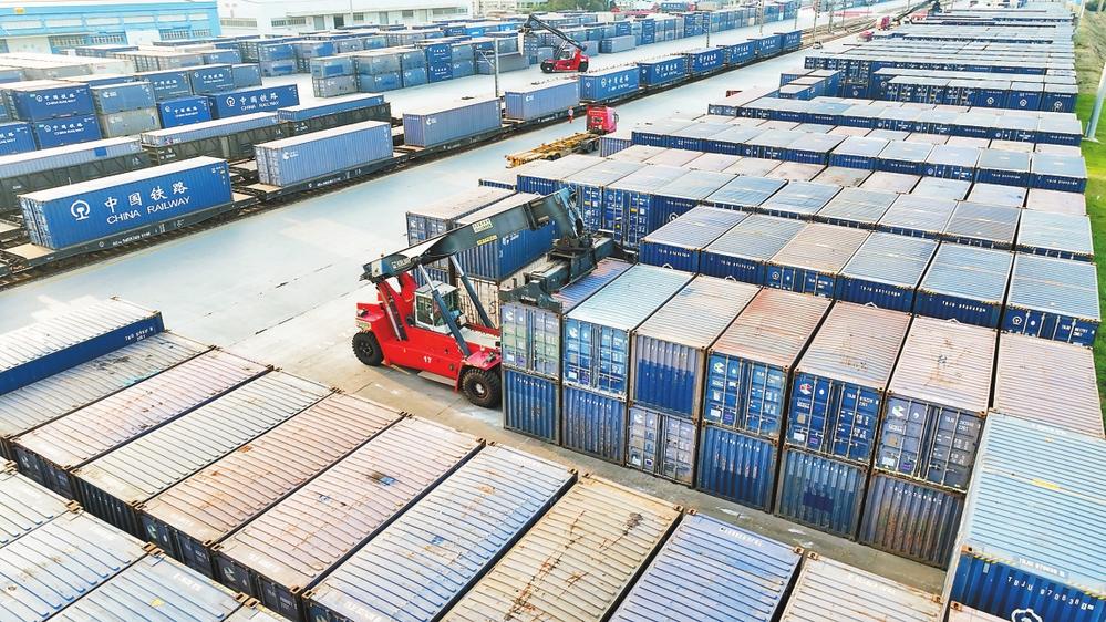 中老铁路“澜湄快线”国际货运列车吊装货物。 云南日报通讯员 周靖博 摄