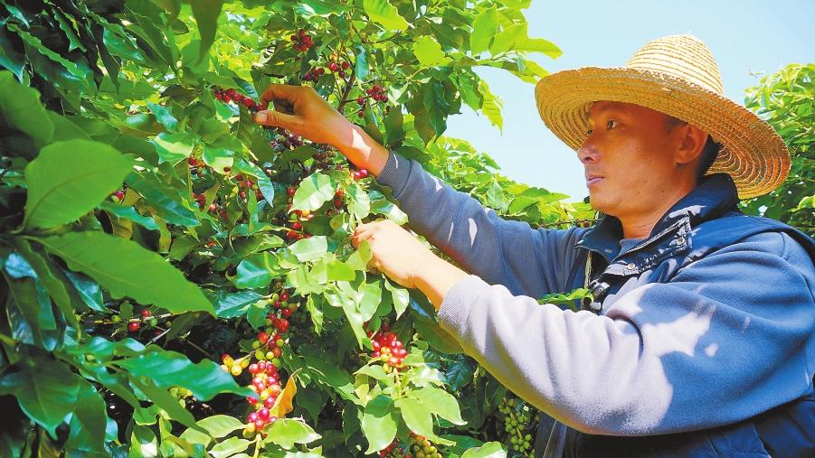 保山市隆阳区新寨村村民采摘咖啡。 云南日报记者 杨艳鹏 摄