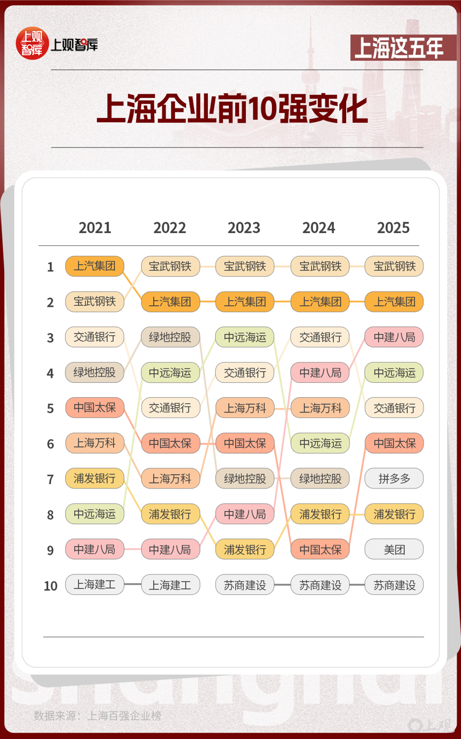 这份由上海市企业联合会、上海市企业家协会、上海市经济团体联合会和解放日报社共同发布的榜单,从2021年到2025年,见证了传统企业的转型与创新企业的涌现。在前10强的名单中,制造业仍然是上海产业的压舱石,而房地产、建筑企业从2021年占比达40%,到2025年占比降低为20%。互联网企业在2025年冲上前10强,并占据了20%的席位,亮出了上海经济多元发展的成绩单。