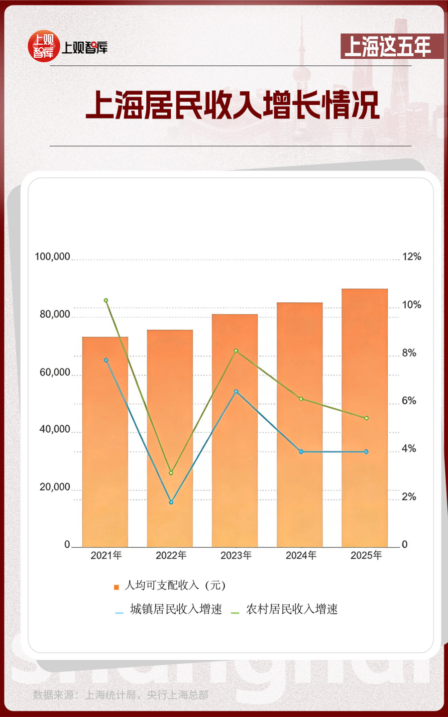 2025年,上海人均可支配收入超过了9万元,对比2021年增长了17.9%;人均消费支出逼近5.5万元,对比2021年增长了12.0%;全市社会消费品零售总额增长4.6%。