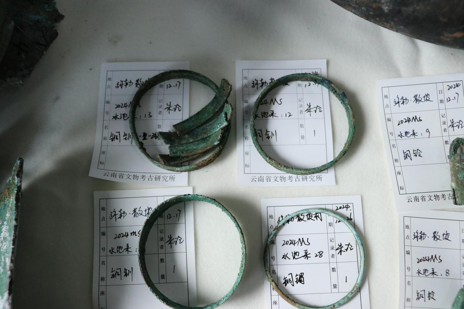 文物部门随即对出土地点及周边展开系统调查与勘探,新发现青铜器、陶器等90余件,并确认该区域存在一处分布面积约3000平方米的青铜时代墓地。2025年10月至2026年1月,经国家文物局批准,云南省文物考古研究所、红河州文物管理所、武汉大学历史学院、弥勒市文物管理所联合组成考古队,对墓地进行了抢救性发掘。