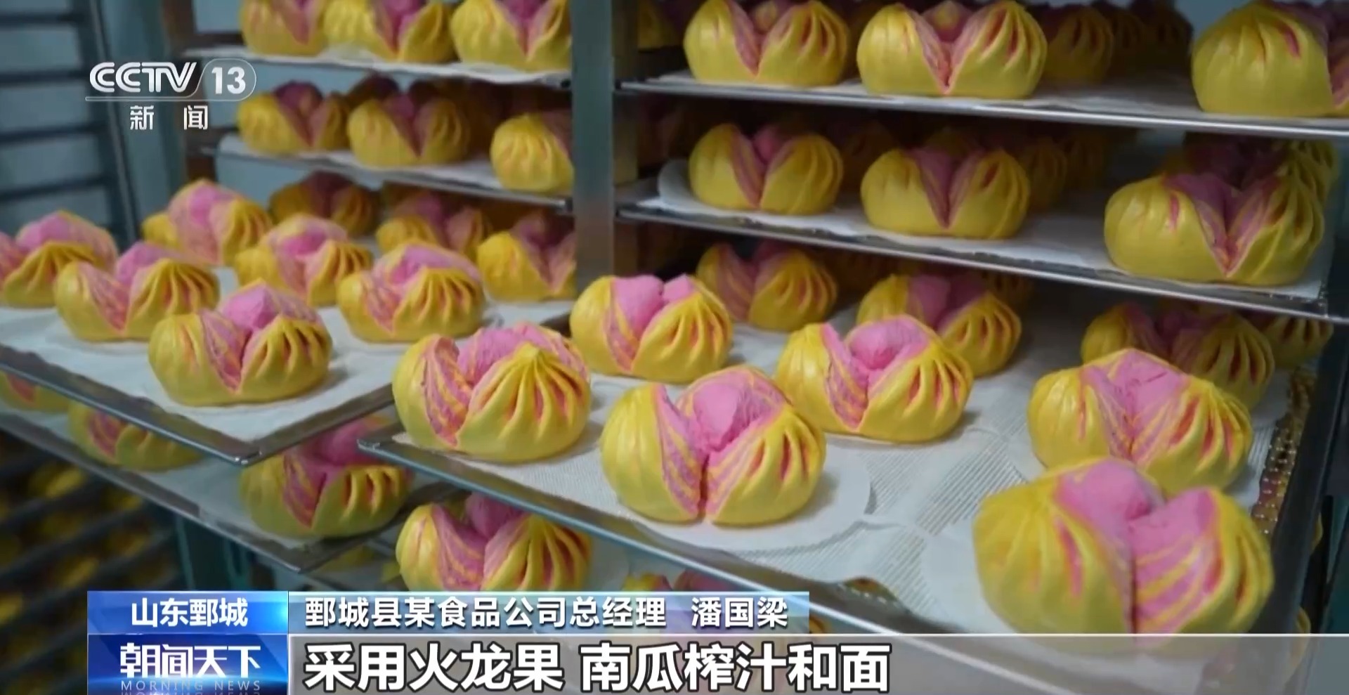 鄄城县某食品公司总经理 潘国梁:针对春节市场需求推出了这款开花馒头,采用火龙果、南瓜榨汁和面,既保证了颜色鲜艳夺目,又自带一股淡淡的清香。馒头一开花,幸福进万家,寓意幸福美满,产品很受市场欢迎。