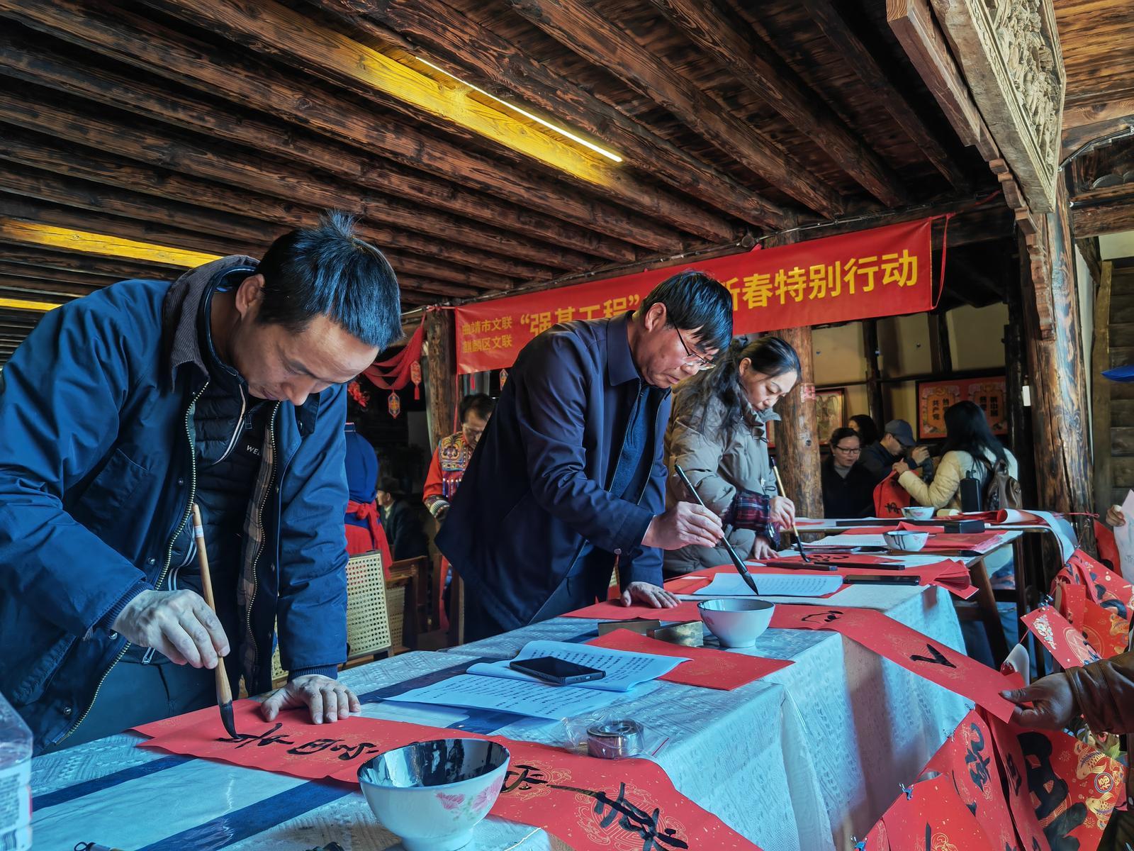 展厅之外,年节氛围更显热烈。曲靖市民族艺术团的精彩文艺节目轮番上演,锣鼓声、欢笑声与老街的烟火气交织;曲靖市文联、麒麟区文联组织的书法名家现场挥毫泼墨,红纸铺展、笔走龙蛇,一副副春联、一个个“福”字应声而成,刚写就的墨香还未散尽,就被等候的市民欢喜领走。