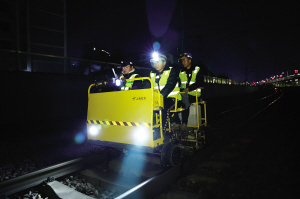 2时10分,行进至下行线1097公里246米处,按计划进行转线探伤。阵阵冷风迎面扑来,钢轨延伸至远方,探伤“小黄车”的灯光和头灯交织在一起,在凌晨的铁道线上格外醒目。