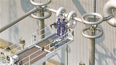 工人正在±800千伏昆柳龙直流工程柳州换流站进行检修作业。