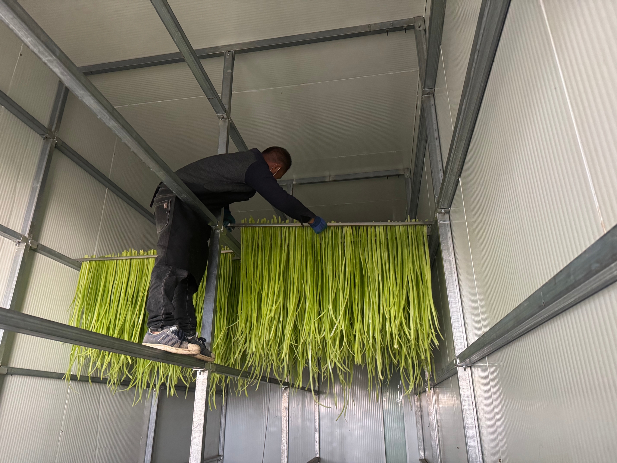 北城街道王棋社区的烤房内,香气扑鼻而来,新鲜贡菜经过削皮、打条后,被有序送入烤房恒温烘烤。依托闲置烤房资源,玉溪年有余农业科技发展有限公司开展贡菜烘干业务,通过不断试验改进烘干工艺、调试炉内风的变向与变量,今年已实现稳定量产。“传统晾晒风干需两到三天,通过空气能热泵电烤房12个小时就能出一炉,并且在整个生产环节能做到隔绝灰尘、细菌和有害杂质。空气能热泵电烤房平均一天能出500到600公斤干货,今年预计能交付100吨干货订单。按照每公斤70元到100元的市场价,平均每一炉产值在2到3万元不等。”公司总经理王俊卜介绍,烤房转型不仅提升了农产品附加值,还带动了周边村民就近就业。公司优先聘用红塔区周边村民,教会他们削皮、打条等技术,让村民实现家门口增收。