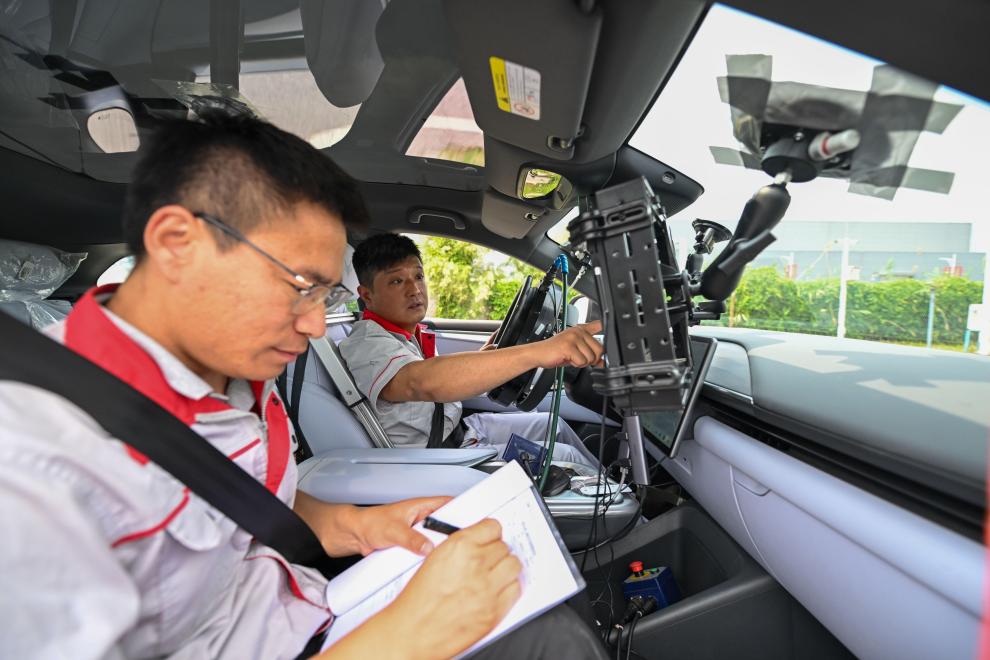 测试员在一辆智能网联汽车内做测试。新华社记者 孙凡越 摄