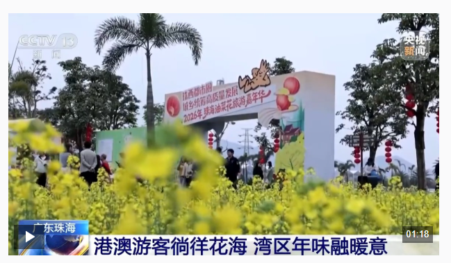 近日,广东珠海斗门的千亩油菜花争相盛开,不少港澳游客专程“北上”,踏春赏花、品味乡韵,沉浸式感受大湾区“一小时生活圈”下的文旅新体验。