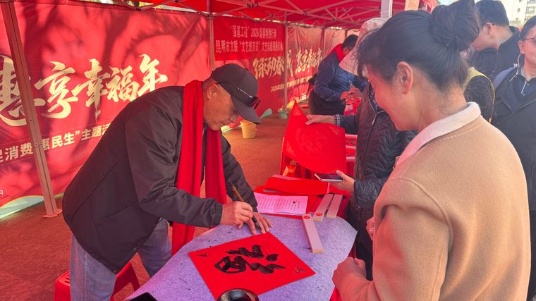 “笔墨凝香·送福绿春城”活动区墨香四溢,书画家、市政协委员与书法爱好者现场挥毫,书写春联和“福”字。内容不仅寄托新春祝福,更融入“绿水青山就是金山银山”“生态春城、幸福家园”等生态文明理念,让传统文化与时代主题交相辉映。