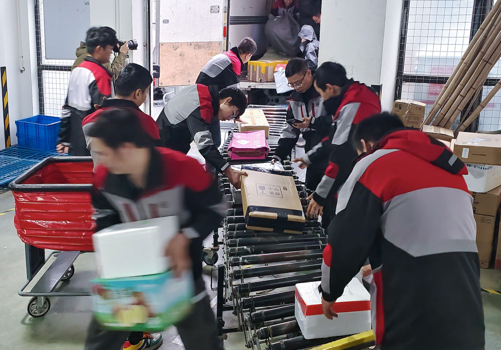2023年11月11日,浙江省宁波市宁海县的快递员在分拣快递。
