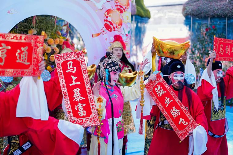 现场还精心筹备了诸多特色互动环节,氛围感拉满。汉服古风少年团为游客赠送新鲜花卉,传递新春祝福;《昆明蓝》歌曲唱响春城的澄澈与浪漫;《四丑闹春・戏变乾坤》财神互动表演及财神巡游轮番上演,为现场游客送上新年福气,让整场发布会既有文化底蕴,又充满节日的热闹气息。