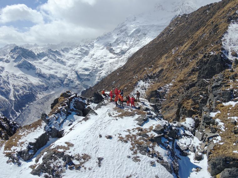 救出3人后,救援队伍顾不上高寒缺氧带来的身体不适,立即投入最后一名失联人员的搜救工作。2月11日6时17分,救援人员再次向神湖进发,一路翻越积雪陡坡、穿越崎岖山路,12时37分抵达搜救核心区域,采取空中无人机搜寻、地面徒步排查的方式不间断搜索。13时15分,无人机发现失联人员位置,确认其生命体征平稳,但腰部受伤、行动不便,被困于高差近10米的狭窄平台,周边地势陡峭、无落脚之处,救援条件极差。16时08分,救援人员联合民警、扑火队分多路向被困位置艰难挺进,因地形险要、现有装备难以展开,支队立即增派力量携带专业器材前往支援。