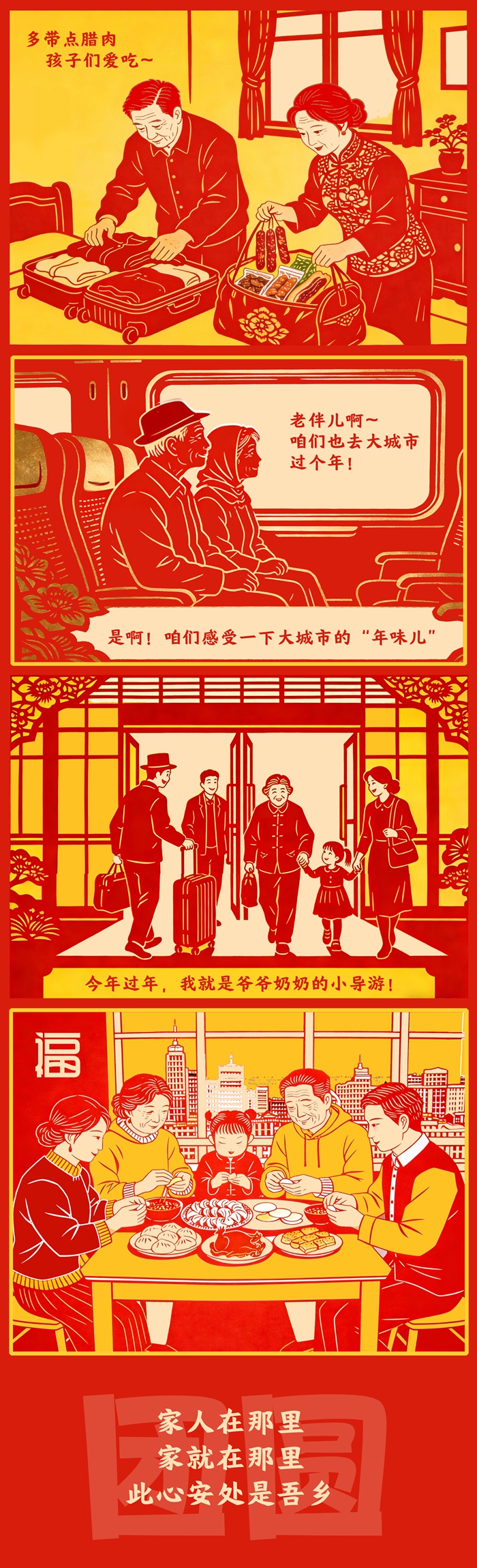 反向春运,远不止出行方式之变,它见证着中国人对“家”的理解,从故土坐标转向亲情纽带。变的,是团圆路径的智慧选择;不变的,是对亲情的永恒珍视。一个充满活力的现代社会,正以其包容与温度,为每一种真挚奔赴铺就道路。流动中国的底色是团圆,动力是亲情,终点永远是家之所在。(文字/泰轩萍 漫画/泰轩萍 编辑/乔佳新)