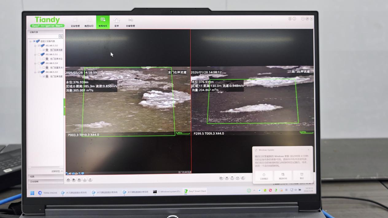 记者看到,晋陕交界的黄河水大小不一的冰凌碎片在随流漂浮,水流缓慢涌动。这一天,又是水文站日常执行巡测作业的日子。站房前,视频影像测流系统安置在靠近悬崖边的护栏处,两台设备正在实时监测黄河水面。