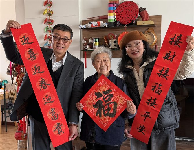 2月7日中午,爱心人士来到云南民族大学宿舍区莲花池畔,为100岁抗战老兵杨毓骧送上祝福,老人非常高兴,绽放出了笑容。在92岁著名音乐家杜丽华老师家中,爱心人士贴上由书法爱好者张树义书写的春联,并再次回忆起杜老师演唱的《阿诗玛》主题曲,大家其乐融融。著名军旅作家张昆华、著名书法家赵翼荣、著名云南文史专家卜保怡等文化名人,也收到了这份温暖问候。