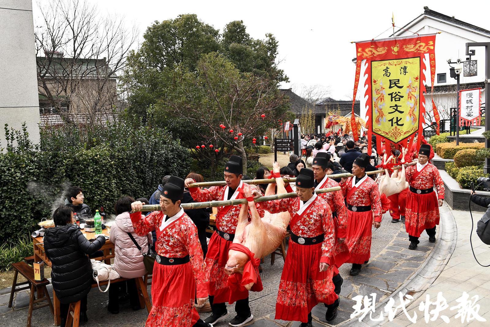 村宴,不仅是味觉的盛宴,更是一场民俗的雅集。2月1日的慢城村宴,是江苏省文学艺术界联合会主办的“迎春花开 马上来福”民艺过大年活动的一部分,集结了苏州桃花坞年画、南京剪纸、扬州漆器、常州梳篦、宜兴紫砂等全省各地民俗非遗,奉上一场全省联动的民间文艺盛宴。摄影、书画艺术家们为50户村民拍摄全家福,还为村民与游客送上装满春联、福字、年灯的新春大礼包。
